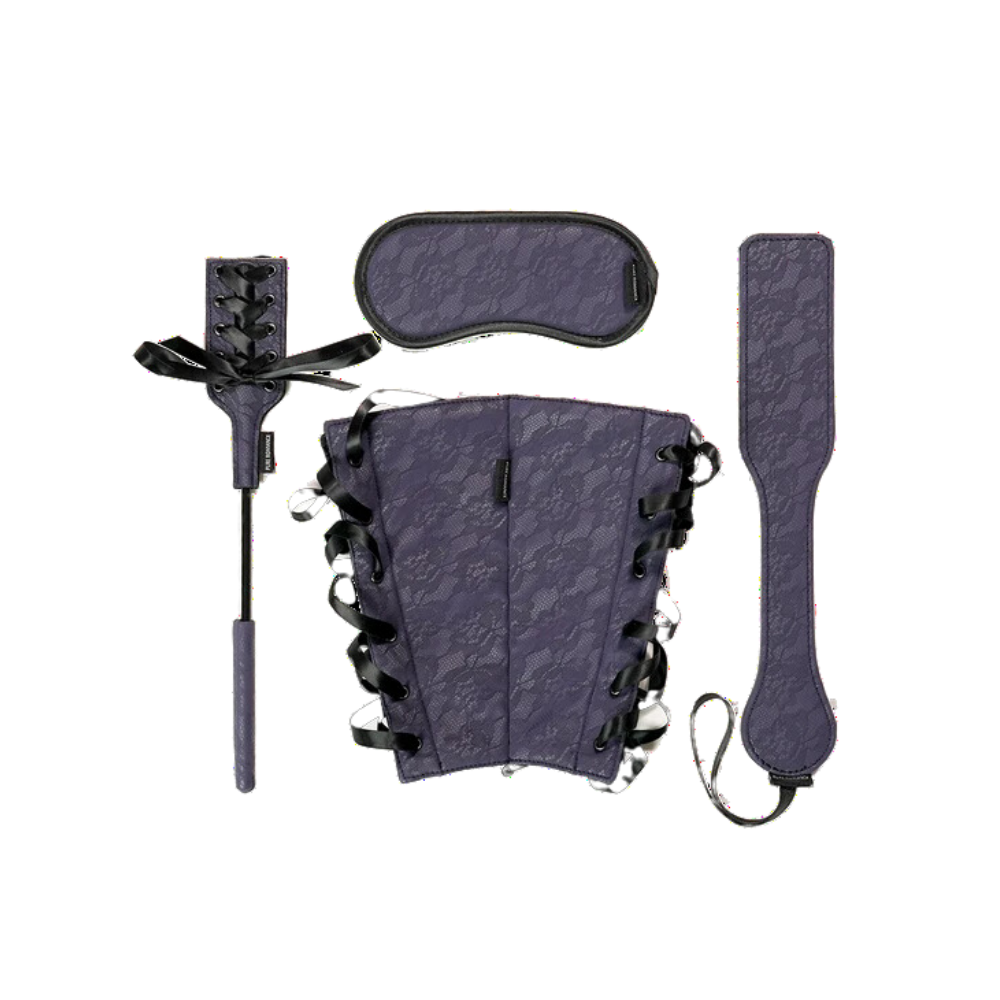 Delve into a whole new world with a luxe, four-part set featuring a blindfold, paddle, crop, and arm restraints. The paddle and crop take painful pleasure experiments to mastery, the blindfold removes sight to spotlight sensation, and the arm restraints bind for sultry submission. Satin accents and plush, lace-print material add a touch of softness to contrast the bold intensity of play. Try each accessory one by one and make it a slow descent into all things erotic, or pair off parts of the set for multi-faceted satisfaction that exceeds expectations time and time again…