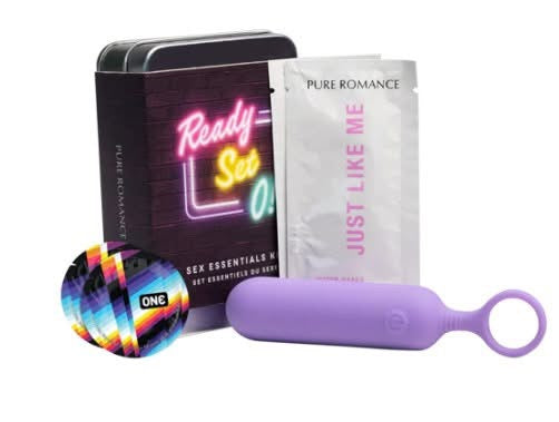 This on the go set features a classic bullet vibe, condoms and sample size Just Like Me lubricant. Perfect for a weekend getaway.